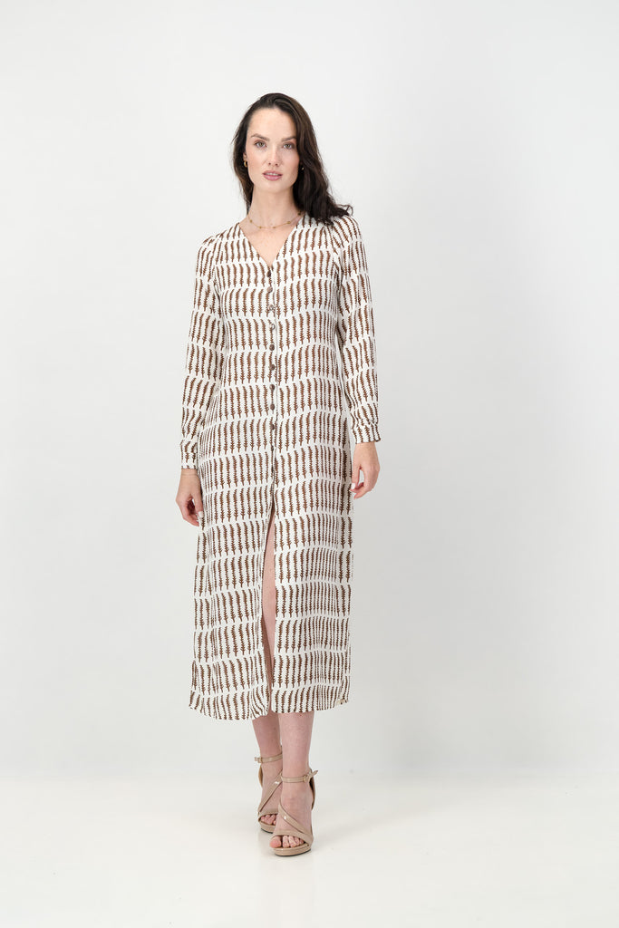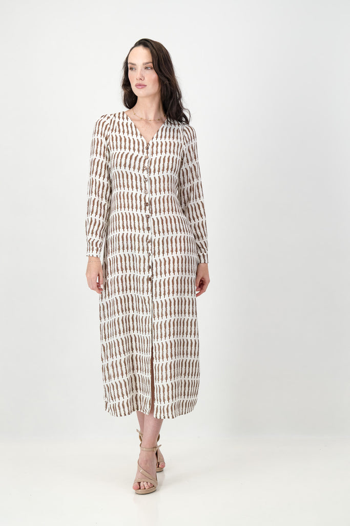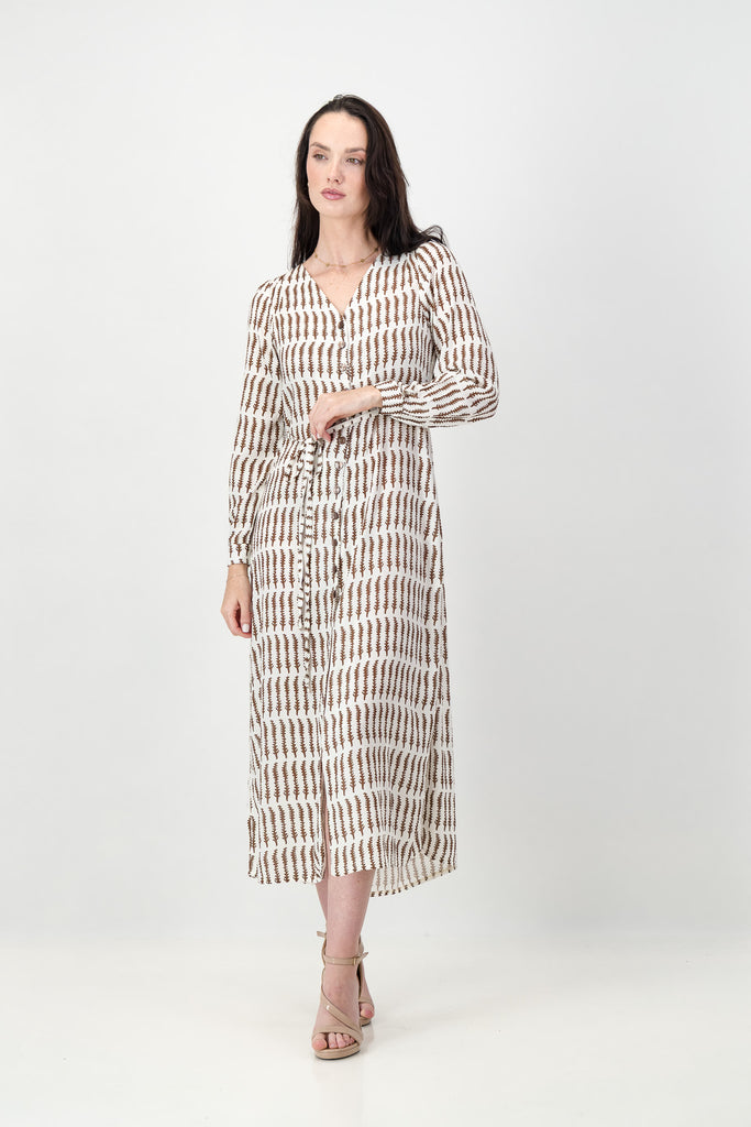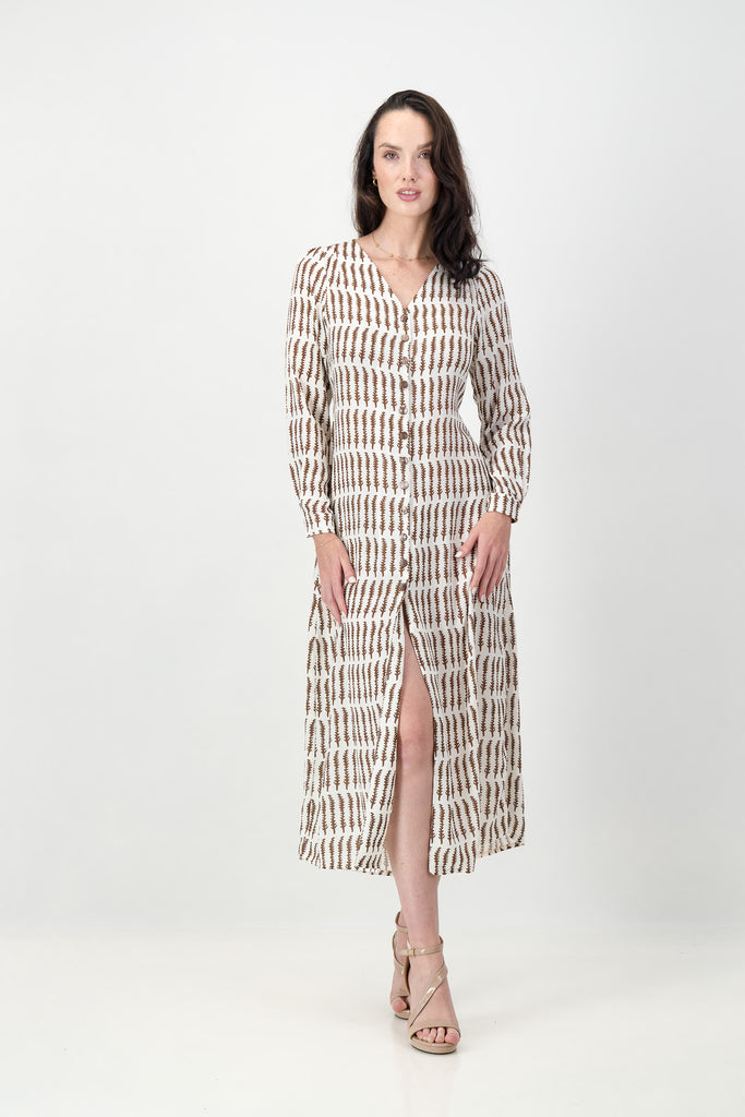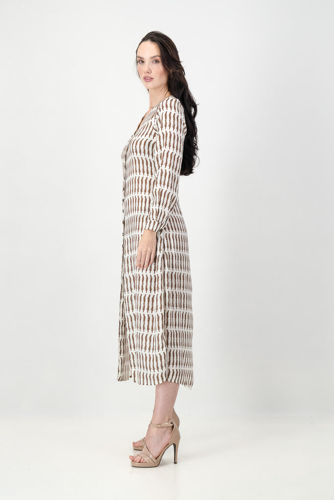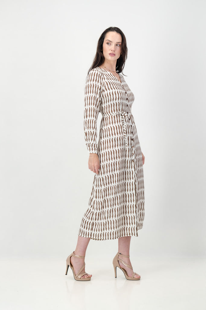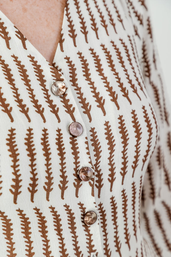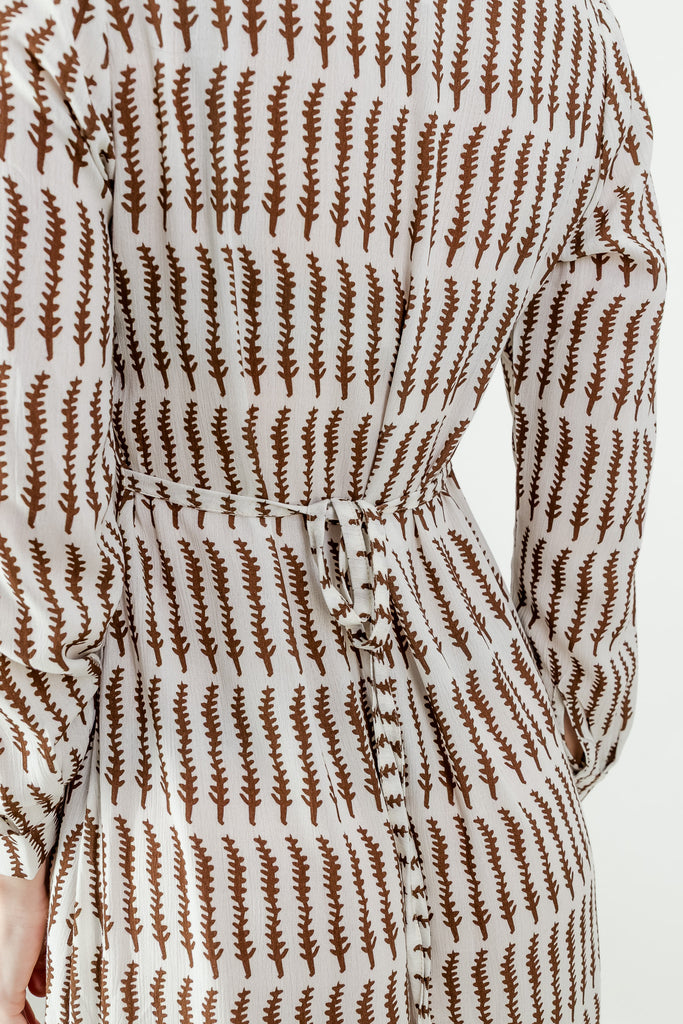 The Button-Down Midi Dress in the Desert Fern print features a relaxed, flowy silhouette with a versatile button-front design. Adjustable waist ties allow you to define your shape your way—cinch at the front or back for a structured fit, or leave them loose for an easy, laid-back feel.