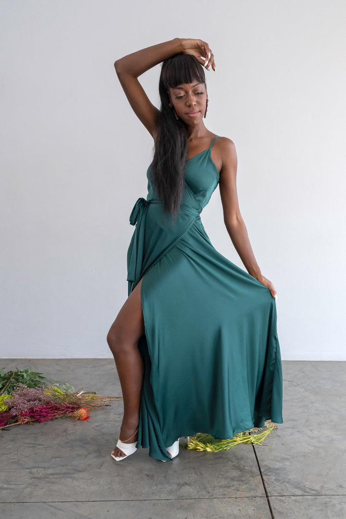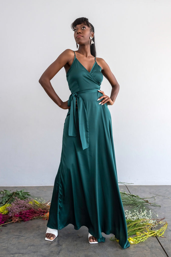 Designed with a flattering wrap silhouette, this dress features delicate spaghetti straps and a deep V-neckline. The wrap design cinches at the waist with an adjustable tie belt while the floor-length hemline adds a sense of drama and flow.